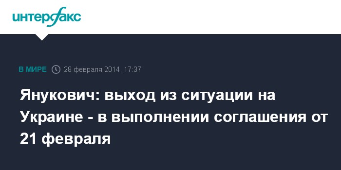 Москва. 28 февраля. INTERFAX.RU - Виктор Янукович видит выход из ситуации, сложившейся на Украине, в выполнении договора, заключенного 21 февраля между президентом Украины и оппозицией.