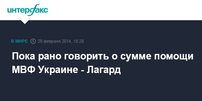 Москва. 28 февраля. INTERFAX.RU - Любые дискуссии об объеме потенциальной международной помощи Украине пока будут преждевременными, заявила журналистам директор-распорядитель Международного валютного фонда (МВФ) Кристин Лагард.