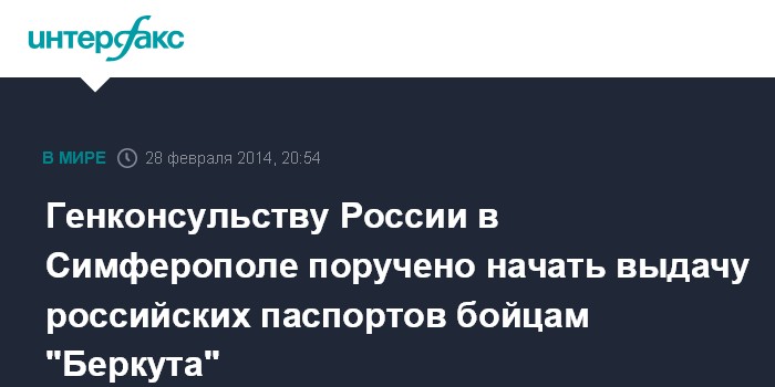 Москва. 28 февраля. INTERFAX.RU - Генеральное консульство РФ в Симферополе начнет выдавать российские паспорта гражданам Украины - бойцам отряда "Беркут", сообщает МИД РФ.