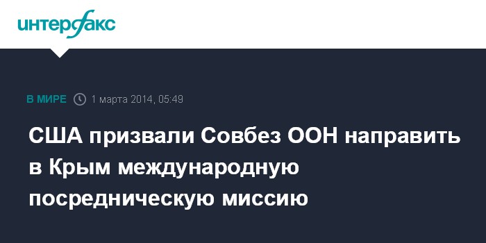 Брюссель. 1 марта. ИНТЕРФАКС-УКРАИНА - США призвали Совет безопасности ООН направить на Украину международную посредническую миссию, сообщила по окончании чрезвычайного заседания Совбеза ООН, которое состоялось в пятницу в Вашингтоне и на котором рассматривалась ситуация в Крыму, посол США в Совбезе ООН Саманта Пауэр.
