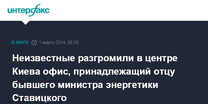 Киев. 1 марта. ИНТЕРФАКС-УКРАИНА - Около 30 человек, которые представились членами "самообороны Майдана", напали в центре Киева на офис отца бывшего министра энергетики и угольной промышленности Украины Эдуарда Ставицкого, который он якобы сдает в аренду юридической фирме.