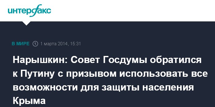 Москва. 1 марта. INTERFAX.RU - Совет Госдумы обратился к президенту России с просьбой принять меры по стабилизации обстановки в Крыму, заявил спикер Сергей Нарышкин. "Совет Госдумы принял обращение к президенту России, в котором депутаты призывают президента принять меры по стабилизации обстановки в Крыму и использовать все имеющиеся возможности для защиты населения Крыма от произвола и насилия" - сообщил С.Нарышкин журналистам в субботу.