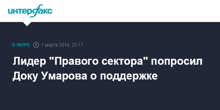 Москва. 1 марта. INTERFAX.RU - Лидер украинской ультрарадикальной организации "Правый сектор" Дмитрий Ярош обратился с просьбой о поддержке к террористу Доку Умарову.