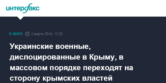 Москва. 2 марта. INTERFAX.RU - Украинские военнослужащие, дислоцированные в Крыму, в массовом порядке переходят на сторону крымских властей, передает корреспондент "Интерфакса" из Крыма. По данным агентства, по состоянию на сегодняшнее утро многие из украинских военных частей в Крыму брошены военнослужащими, арсеналы оставлены. Сейчас они взяты под контроль силами самообороны Крыма.