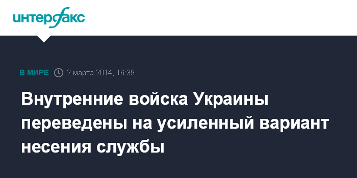 Москва. 2 марта. INTERFAX.RU - Внутренние войска министерства внутренних дел Украины переведены на усиленный вариант несения службы в связи с последними событиями в Крыму. Как сообщает пресс-служба ВВ МВД Украины в воскресенье, такие действия ВВ МВД были предприняты с целью предотвращения "любых террористических проявлений". "Была усилена охрана АЭС и других особо важных государственных объектов, находящихся под охраной внутренних войск МВД Украины", - отмечается в сообщении.