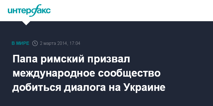 Москва. 2 марта. INTERFAX.RU - Международное сообщество должно стремиться подтолкнуть противоборствующие стороны на Украине к диалогу, заявил в воскресенье папа римский Франциск.
