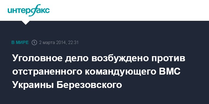 Москва. 2 марта. INTERFAX.RU - Замсекретаря Совета национальной безопасности и обороны Украины Виктория Сюмар заявляет, что Генеральная прокуратура начала уголовное производство в отношении отстраненного командующего ВМС ВС Украины Дениса Березовского по статье 111 УК "Государственная измена".