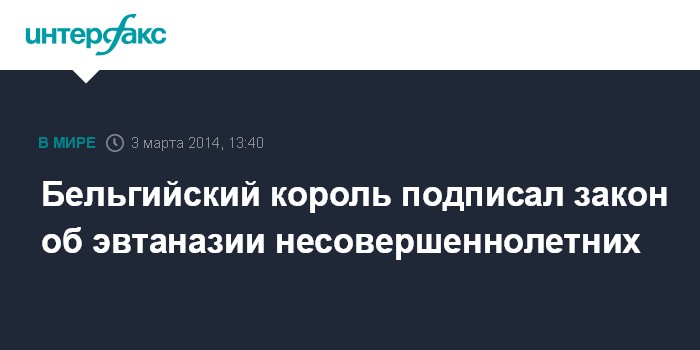 Москва. 3 марта. INTERFAX.RU - Король Бельгии Филипп одобрил закон, предусматривающий возможность эвтаназии детей в случае неизлечимых заболеваний, причиняющих им невыносимые страдания, передает в понедельник агентство EFE.