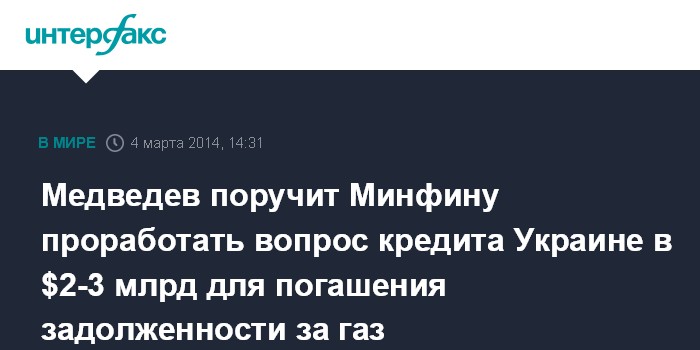 Москва. 4 марта. INTERFAX.RU - Премьер-министр России Дмитрий Медведев заявил, что поручит Минфину России взвесить все возможности и риски предоставления Украине кредита в $2-3 млрд для расчетов с "Газпромом" за поставленный газ.