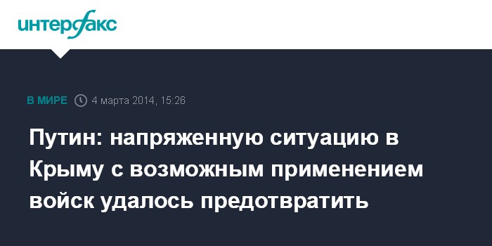 Москва. 4 марта. INTERFAX.RU - Президент России Владимир Путин заявил, что напряженную ситуацию на территории Крыма, при которой было возможно использование вооруженных сил, удалось предотвратить. "В этом не было никакой необходимости", - заявил Путин на встрече с журналистами в Ново-Огарево.