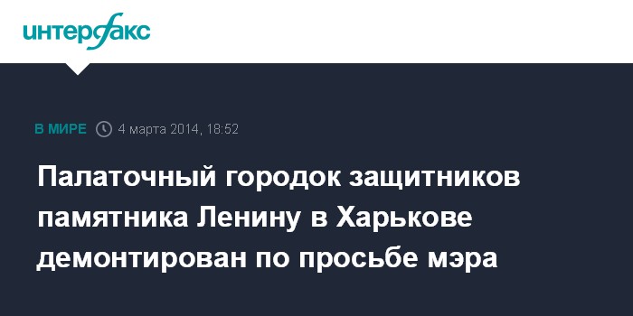 Москва. 4 марта. INTERFAX.RU - Палаточный городок защитников памятника Ленину на площади Свободы в Харькове демонтирован по просьбе городского головы Геннадия Кернеса.