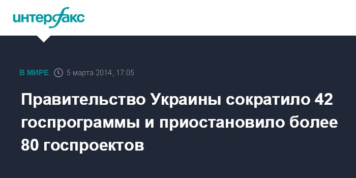 Москва. 5 марта. INTERFAX.RU - Кабинет министров Украины принял постановление, согласно которому будут сокращены 42 государственных программы из-за отсутствия финансирования.