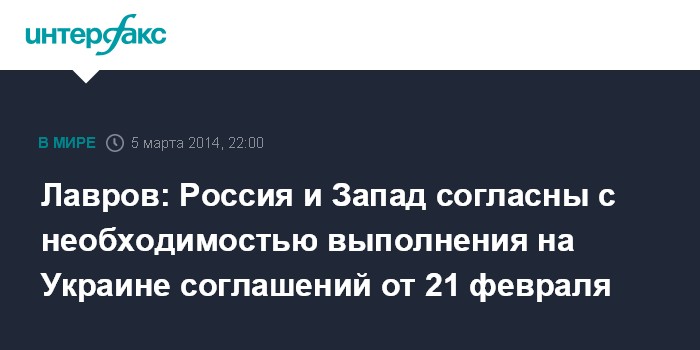 Москва. 5 марта. INTERFAX.RU - Западные партнеры согласны с Москвой, что необходимо реализовывать соглашения между украинской оппозицией и правительством от 21 февраля, заявил глава МИД РФ Сергей Лавров.