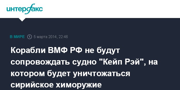 Москва. 5 марта. INTERFAX.RU -Генсек НАТО Андерс Фог Расмуссен заявил, что по итогам совета Россия-НАТО было принято решение, что российские корабли не будут участвовать в обеспечении безопасности американского судна "Кейп Рэй", на котором будет уничтожаться вывезенное из Сирии химоружие.