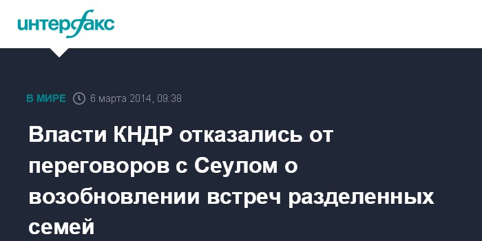 Москва. 6 марта. INTERFAX.RU - Руководство КНДР отклонило предложение Южной Кореи организовать 12 марта двустороннюю рабочую встречу для обсуждения возобновления встреч семей, разделенных Корейской войной, сообщила в интервью агентству ЭФЭ представитель южнокорейского министерства по делам объединения.