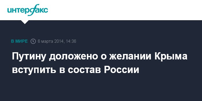 Как сообщалось, верховный совет Крыма в четверг принял решение о вхождении автономии в состав России. Об этом сообщил пресс-центр крымского парламента. Верховный совет АРК также обратился к президенту Российской Федерации и Федеральному собранию Российской Федерации с предложением о начале процедуры вхождения Крыма в состав Российской Федерации в качестве субъекта РФ.