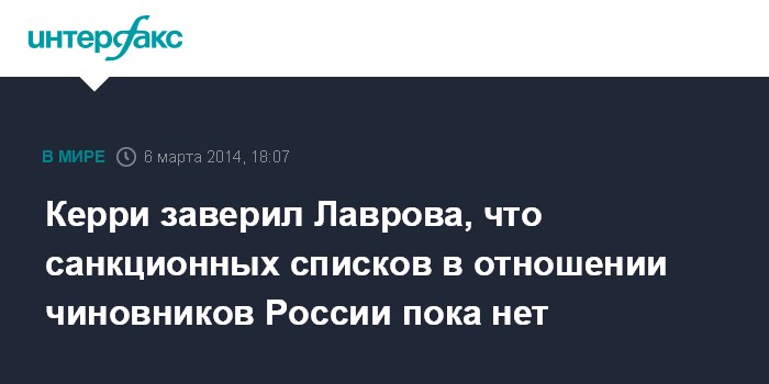 Москва. 6 марта. INTERFAX.RU - Глава МИД РФ Сергей Лавров заявил, что получил от госсекретаря США Джона Керри заверения в том, что списков российских чиновников, в отношении которых США хотят ввести санкции в связи с ситуацией на Украине, не существует, однако заявления о возможности таких санкций все равно являются угрозами.