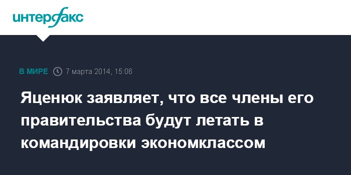 Киев. 7 марта. INTERFAX.RU - Премьер-министр Украины Арсений Яценюк заявляет, что все члены его правительства в командировки будут летать экономклассом.