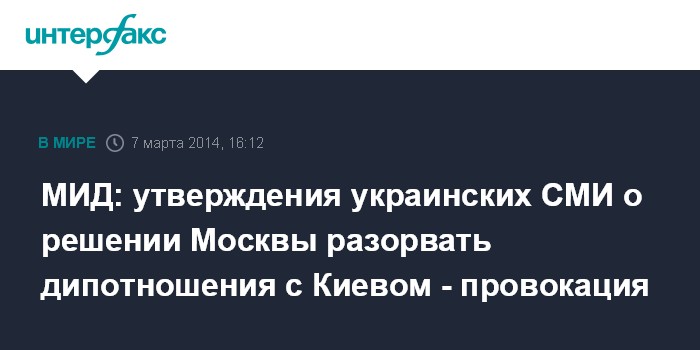 "В МИД России удивлены и даже шокированы тем, как многие украинские СМИ грубо искажают высказывания постпреда России при ООН относительно контактов российской стороны с представителями властей в Киеве. Особенно провокационно звучит запущенный тезис о якобы решении Москвы разорвать в нынешней ситуации дипотношения с Украиной", - заявили "Интерфаксу" в МИД РФ.