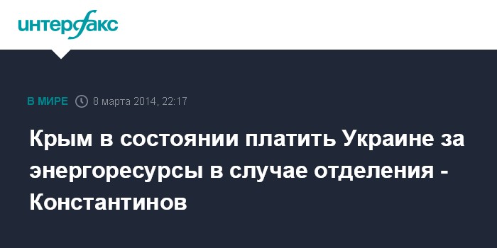 Симферополь. 8 марта. ИНТЕРФАКС - Председатель Верховного совета Автономной республики Крым Владимир Константинов обещает своевременно оплачивать Украине поставку энергоресурсов при любом развитии событий.