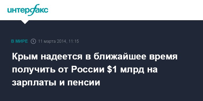 "В ближайшие месяцы объем финансовой поддержки из России Крыму может составить порядка миллиарда долларов. В самые ближайшие дни мы при поддержке России выплатим все зарплаты, пенсии и все социальные выплаты", - сказал он.