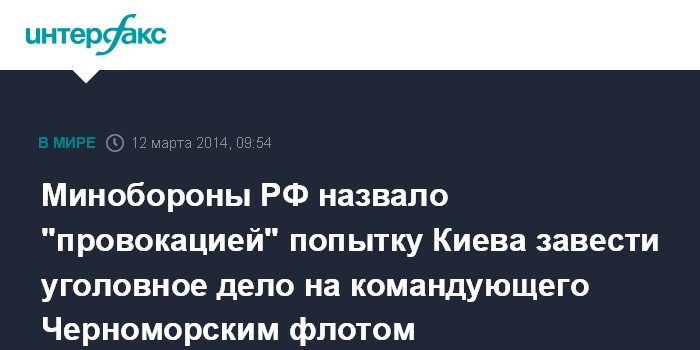 Москва. 12 марта. INTERFAX.RU - Попытку нелегитимных киевских властей завести уголовное дело на командующего Черноморским флотом вице-адмирала Александра Витко в Минобороны РФ расценивают как очередную провокацию, направленную на дестабилизацию обстановки в Крыму.