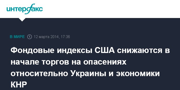 Нью-Йорк. 12 марта. INTERFAX.RU - Американские фондовые индексы снижаются в первые минуты торгов в среду, участники рынка обеспокоены ситуацией вокруг Украины и замедлением темпов роста экономики Китая, сообщает агентство Bloomberg.