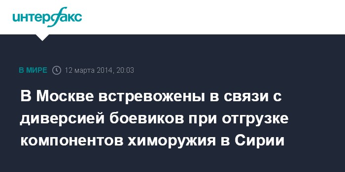 "В Москве с тревогой воспринято известие о новой чрезвычайно опасной попытке экстремистов воспрепятствовать реализации утвержденного ОЗХО плана вывоза химического оружия и его компонентов из Сирии с целью последующего уничтожения", - говорится в комментарии официального представителя МИД России Александра Лукашевича, текст которого размещен в среду на сайте ведомства.