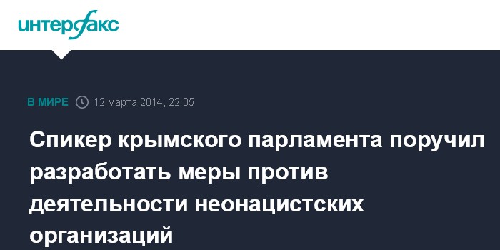 Спикер парламента поручил Минюсту, службе безопасности Крыма, республиканской прокуратуре "разработать и утвердить планы мероприятий, направленных на недопущение деятельности в Крыму политических партий и общественных организаций профашистского и неонацистского толка, в том числе ВО "Свобода", организации "Правый сектор" и входящих в него структурных образований, других организаций и лиц, которые разжигают межнациональную рознь, призывают к насилию, несут угрозу для жизни и безопасности крымчан".