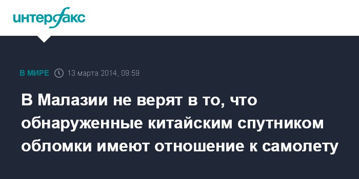 Дели. 13 марта. INTERFAX.RU - В малазийском управлении гражданской авиации не верят, что на снимках, сделанных китайским спутником, действительно изображены обломки пропавшего в субботу авиалайнера Malaysia Airlines, передает в четверг агентство AP.