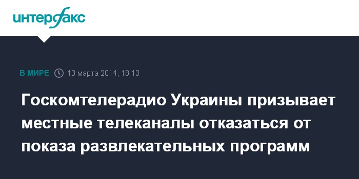 Москва. 13 марта. INTERFAX.RU - Киев. 13 марта. ИНТЕРФАКС-УКРАИНА - Государственный комитет телевидения и радиовещания (Госкомтелерадио) Украины призвал руководителей украинских телеканалов пересмотреть программирование.