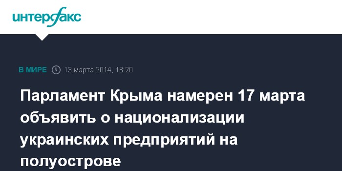 "В понедельник сессия Верховного Совета Крыма примет решение, которое будет касаться непосредственно тех активов, которые принадлежали государству Украина или различным государственным ведомствам. Данные предприятия будут национализированы и будут принадлежать Крыму", - сказал он в четверг журналистам.