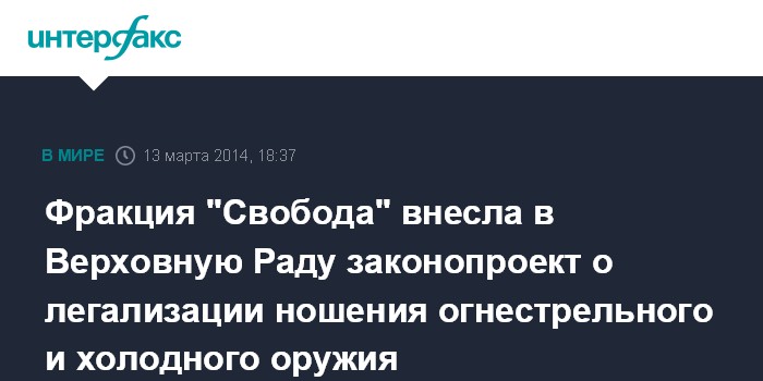 Москва. 13 марта. INTERFAX.RU - Парламентская фракция националистической партии "Свобода" намерена предложить Верховной Раде Украины легализировать ношение огнестрельного и холодного оружия.