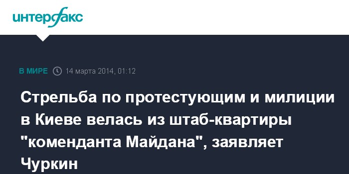 Москва. 14 марта. INTERFAX.RU - По последним данным, стрельба снайперов по протестующим и сотрудникам правоохранительных органов во время беспорядков в Киеве велась из штаб-квартиры "коменданта Майдана", заявил постпред РФ при ООН Виталий Чуркин.