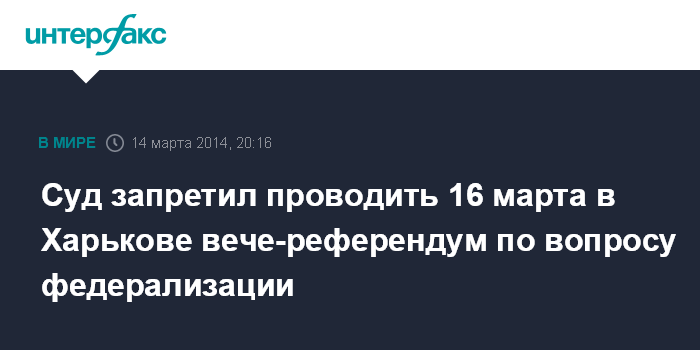 "Административный иск Харьковского горсовета к инициативной группе харьковчан в лице Логвинова Егора Витальевича удовлетворить. Ограничить право на собрание путем запрета инициативной группе в лице Логвинова Егора Витальевича на проведение 16.03 2014 г в 12.00 в Харькове на площади Свободы в городе Харькова вече-референдума по вопросу федерализации Харьковской области", - говорится в постановлении, принятом судьей Андреем Зинченко в пятницу.