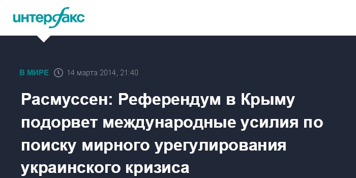 "Планируемый на 16 марта так называемый референдум в украинской Автономной Республике Крым будет прямым нарушением Конституции Украины и международного права. Если он состоится, то не будет иметь юридической силы или политической легитимности", - говорится в заявлении Расмуссена, распространенном в Брюсселе в пятницу.