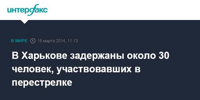 Москва. 15 марта. INTERFAX.RU - Около 30 человек, участвовавших в перестрелке в ночь на субботу в центре Харькова, задержаны, сообщил министр внутренних дел Украины Арсен Аваков. "По итогам ночной перестрелки радикалов в Харькове. К утру ситуация разрядилась. На месте столкновения работают криминалисты. Задержано около тридцати человек с обеих сторон конфликта. Двое убитых, несколько человек ранены, в том числе тяжело ранен милиционер. У обеих сторон изъято оружие. Идут следственные действия", - написал А.Аваков на своей страничке в Facebook.