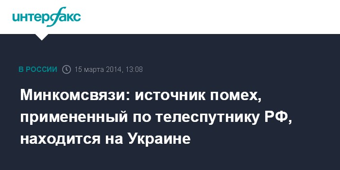 Москва. 15 марта. INTERFAX.RU - Службы Минкомсвязи РФ определили расположение на территории Украины источника попытки нанесения помехи российскому телевизионному спутнику. "Соответствующие службы ведомства определили точное расположение на территории Украины источника попытки нанесения помехи российскому телевизионному спутнику", - сообщил "Интерфаксу" представитель Минкомсвязи.