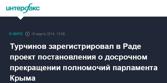 Москва. 15 марта. INTERFAX.RU - В Верховной Раде Украины зарегистрирован проект постановления о досрочном прекращении полномочий Верховного Совета Автономной республики Крым.