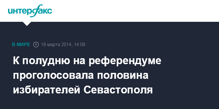 Москва. 16 марта. INTERFAX.RU - К 12.00 к избирательным урнам пришла половина избирателей Севастополя и сделала свой выбор на общекрымском референдуме, сообщил журналистам и.о. главы города Дмитрий Белик.