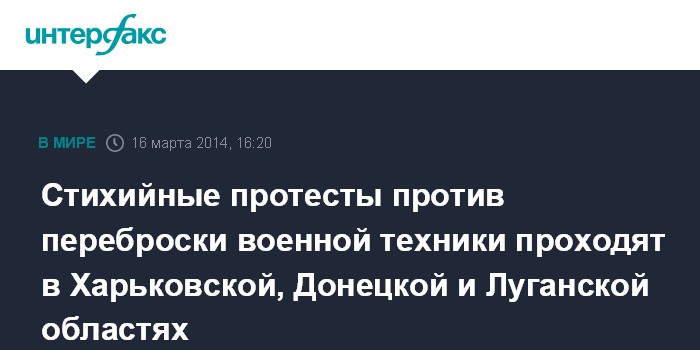 Москва. 16 марта. INTERFAX.RU - Жители восточных регионов Украины препятствуют выгрузке военной бронетехники, прибывающей по железной дороге.