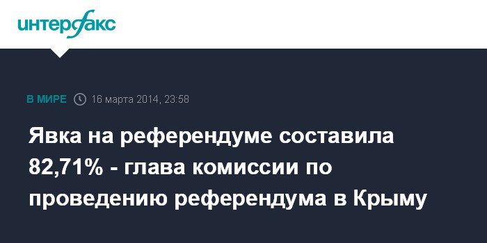 Москва. 16 марта. INTERFAX.RU - Явка на референдуме в Крыму составила 82,71%, заявил глава комиссии по проведению референдума Михаил Малышев.