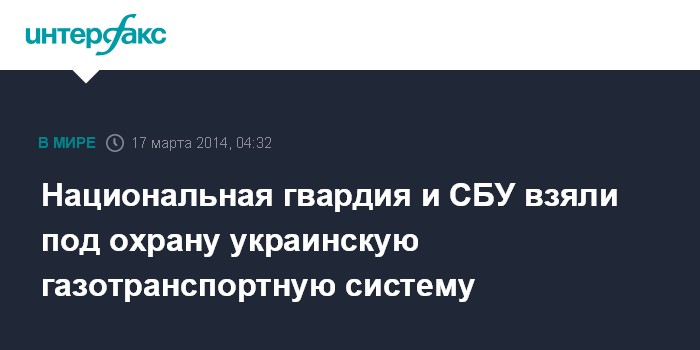 Киев. 17 марта. ИНТЕРФАКС-УКРАИНА - Национальная гвардия Украины и Служба безопасности Украины (СБУ) взяли под охрану газотранспортную систему Украины, сообщает МВД Украины.
