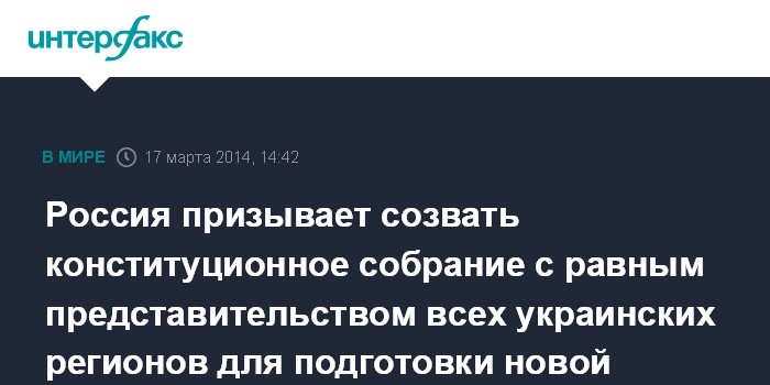 Москва. 17 марта. INTERFAX.RU - Россия призывает без промедления созвать на Украине конституционное собрание с равным представительством всех украинских регионов для подготовки новой федеративной Конституции, заявляет МИД РФ.