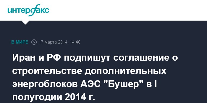Иран и РФ подпишут соглашение о строительстве дополнительных энергоблоков АЭС "Бушер" в I полугодии 2014 г.