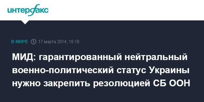 Москва. 17 марта. INTERFAX.RU - Москва выступает за гарантированный нейтральный военно-политический статус Украины и его закрепление в резолюции СБ ООН.