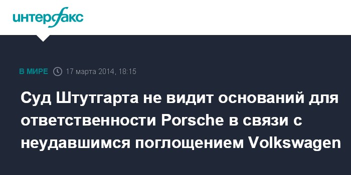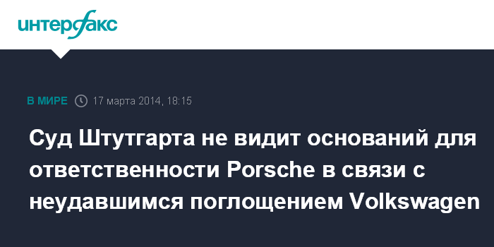 Штутгартский суд, по данным Bloomberg, - уже второй, который принял решение в пользу Porsche. Общая сумма предъявленных автоконцерну исков в связи с попыткой поглощения Volkswagen только в Германии превышала 5 млрд евро.