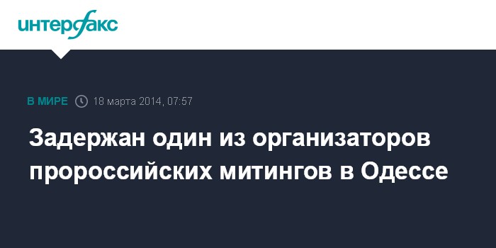 Москва. 18 марта. INTERFAX.RU - Сотрудники Службы безопасности Украины задержали одного из организаторов пророссийских митингов в Одессе - лидера организации "Молодежное единство" Антона Давидченко.
