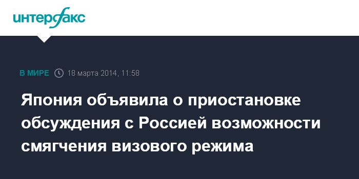Токио. 18 марта. INTERFAX.RU - Токио приостанавливает переговоры с Москвой о смягчении визового режима в качестве меры воздействия на Россию в связи с признанием независимости Крыма, заявил глава МИД Японии Фумио Кисида.