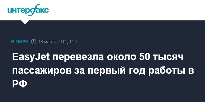 Москва. 18 марта. INTERFAX.RU - Британская бюджетная авиакомпания easyJet Plc за первый год работы на российском рынке перевезла из России в Великобританию и обратно около 50 тыс. пассажиров.
